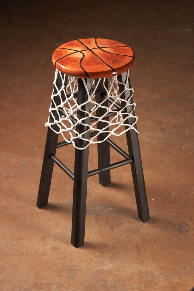 Paint the legs black. (Let each coat dry.)Paint the seat orange. Sponge paint darker reddish orange and white on top as in pic. Then make the black lines with a small brush. Spray the stool with a clear coat. Then staple a basketball net under the seat.