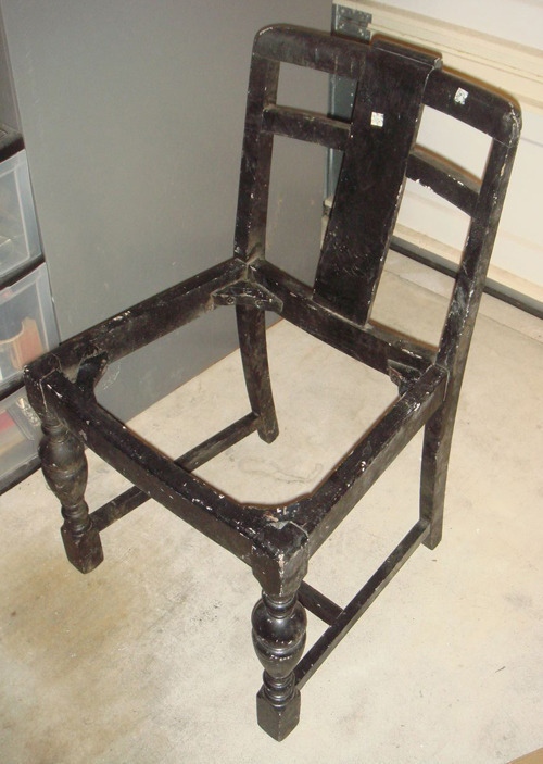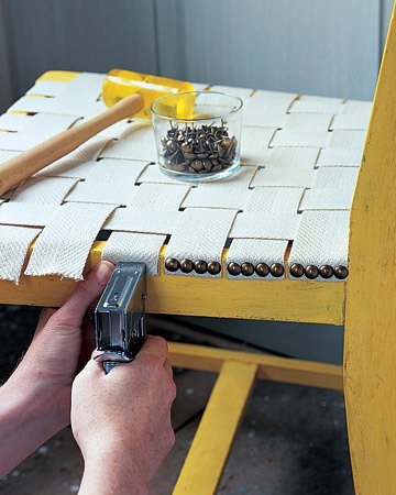After painting the base to match your decor, weave some cotton or nylon webbing to re-create the seat. Staple on and then mallet in decorative studs. Love it!