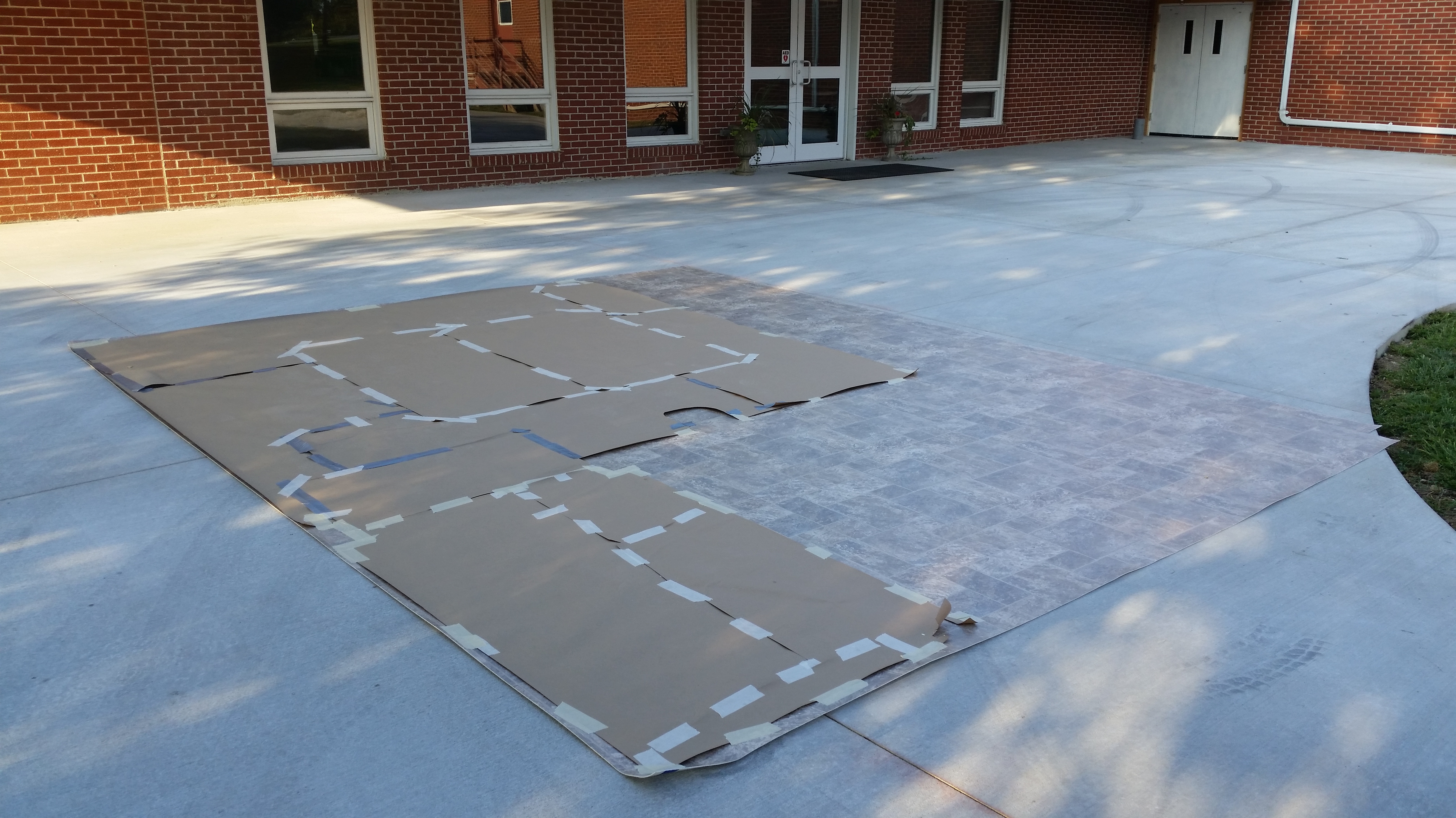 Carefully roll up your pattern. Take your vinyl, pattern and a broom to a business that has a nice flat driveway. (We called a family member who gave us permission to use their church’s front walkway – it worked great!)
